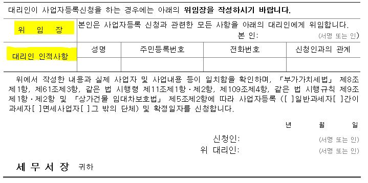 ① 사업자 본인 서명이나 날인이 들어간 위임장 (사업자등록신청서 양식 뒤 쪽에 있음)