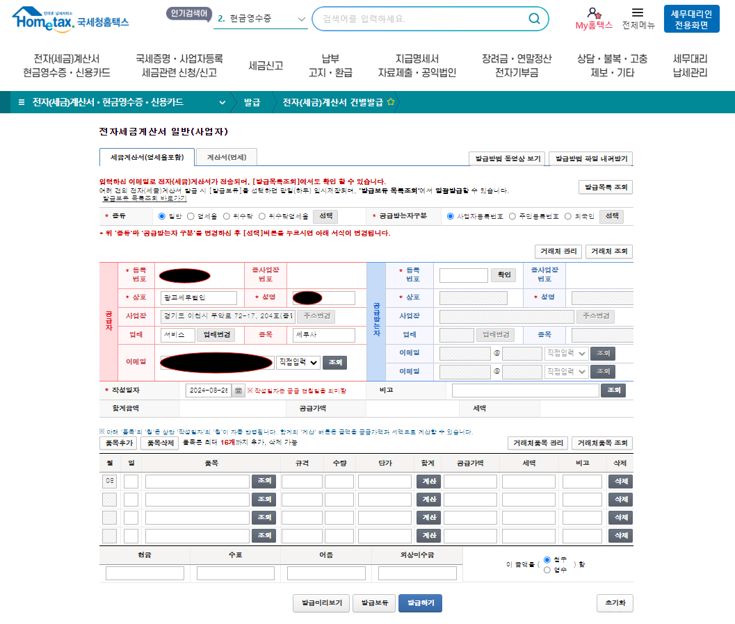 [2단계] 홈텍스에서 개인사업자 또는 법인으로 로그인 후 전자세금계산서  발급